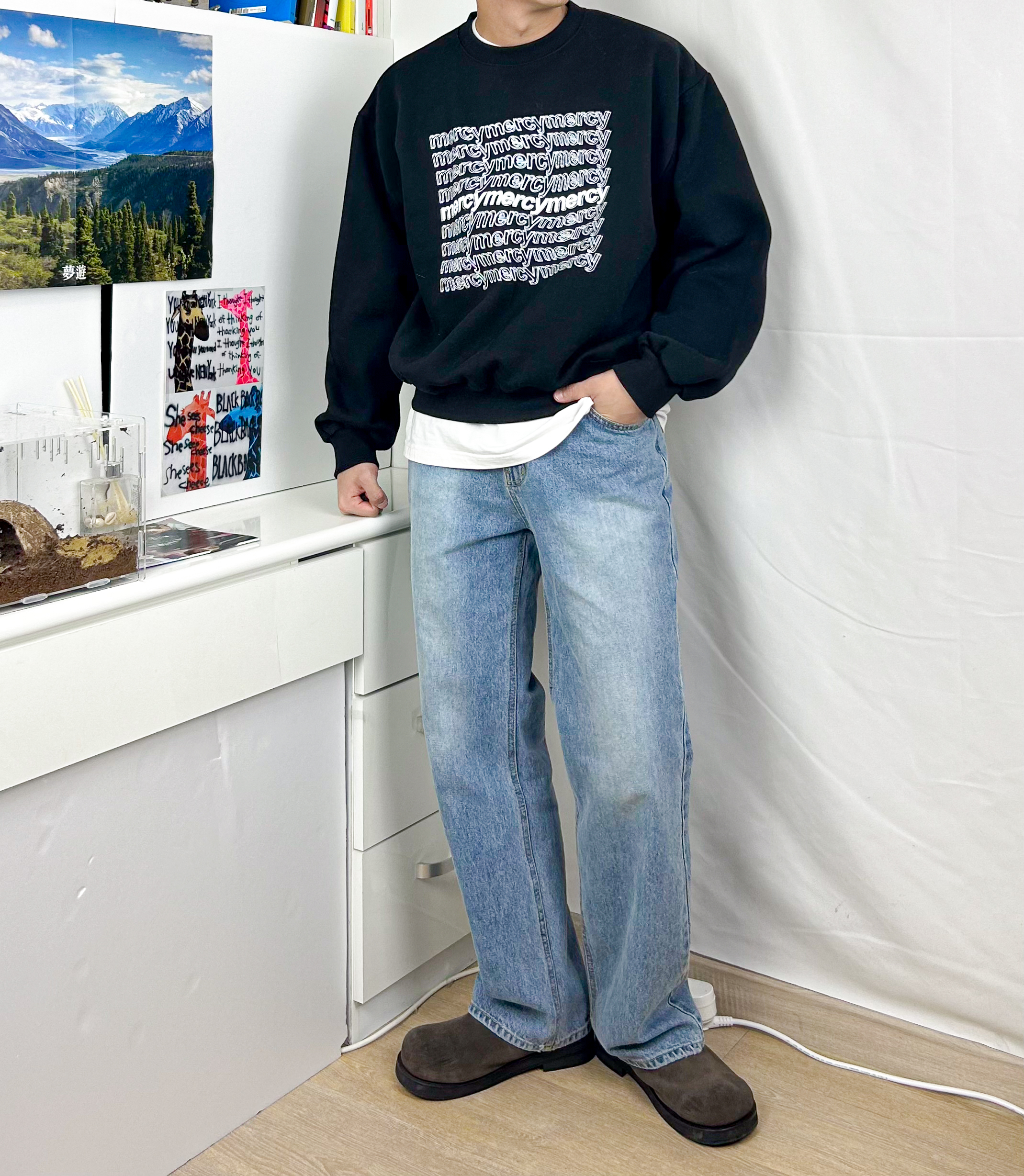 아래 사진은 기본 맨투맨을 다른 두 스타일로 코디한 사진이다.