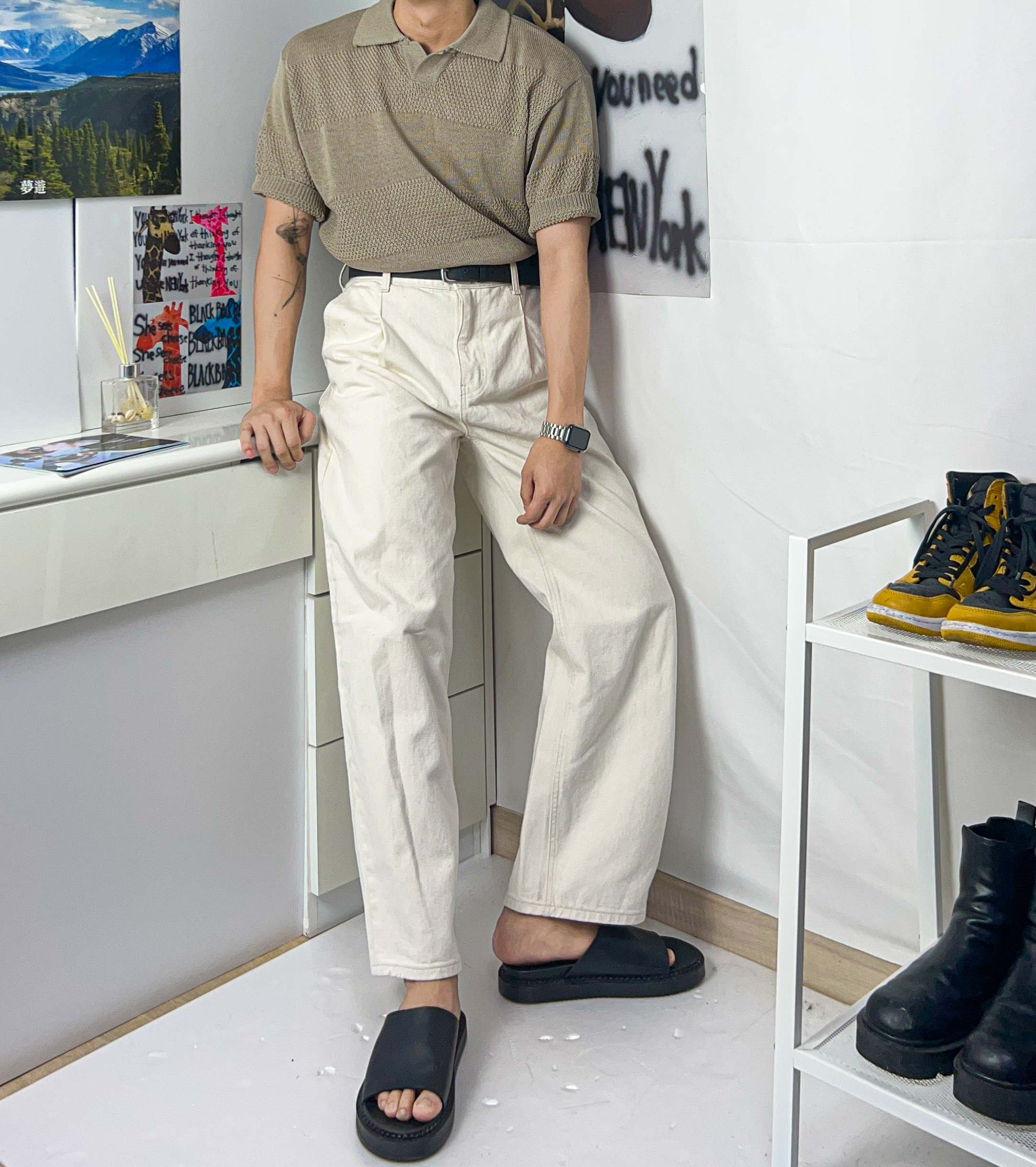 니트 소재의 반팔을 활용해서 코디를 해주면 깔끔하면서 고급스러운 느낌을 주기 좋음!
