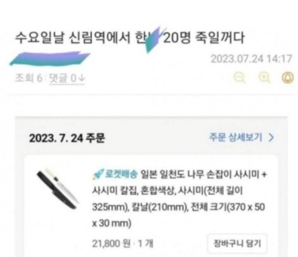 지난 7월 21일에 신림역 칼부림 사건이 나기 전, 칼을 들고 신림역 근처를 돌아다녔다는 제보가 있었다.