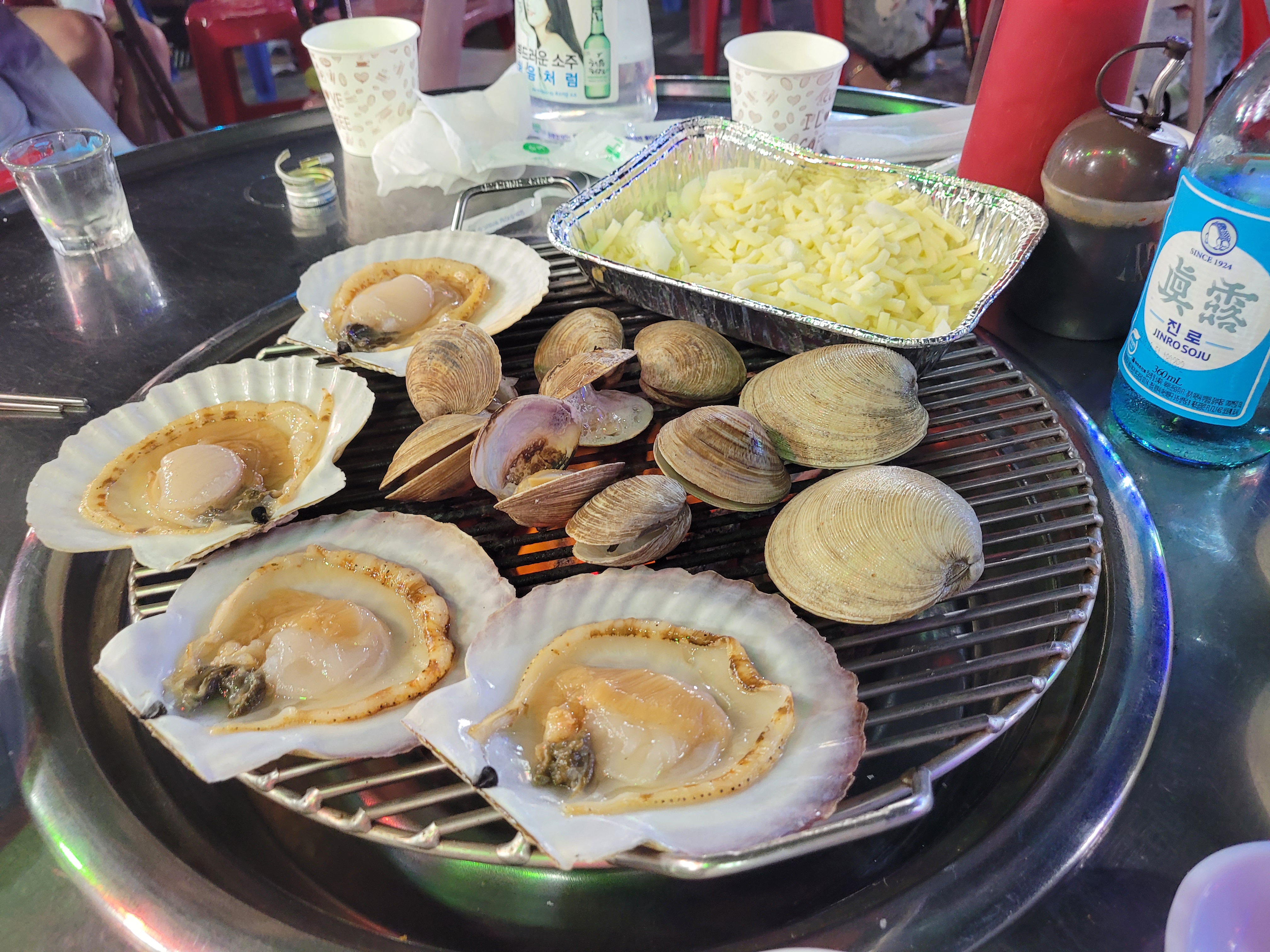 셋이서 뭐를 더 먹을까 고민하다가 숙소 바로 앞에 조개구이 집이 있어서 거기를 가기로 했음.